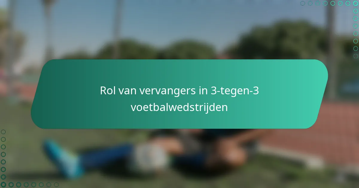 Vervangingen in 3-tegen-3 voetbal spelen een cruciale rol in het beheren van spelersmoeheid en tactische flexibiliteit, wat aanzienlijk verschilt van 11-tegen-11 wedstrijden. De kleinere teamgrootte maakt frequentere vervangingen mogelijk, wat de dynamiek van het spel en de algehele prestaties beïnvloedt.